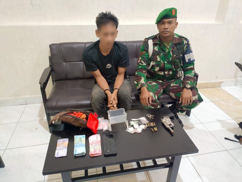 Pelaku, BD (46), diamankan saat hendak melakukan transaksi. Dari tangannya, petugas menyita satu pucuk senpira revolver beserta 9 butir amunisi, 24 gram sabu, serta barang bukti lainnya. Penangkapan ini berawal dari laporan masyarakat yang mencurigai adanya peredaran narkoba di wilayah tersebut dan dugaan keterlibatan oknum TNI.
