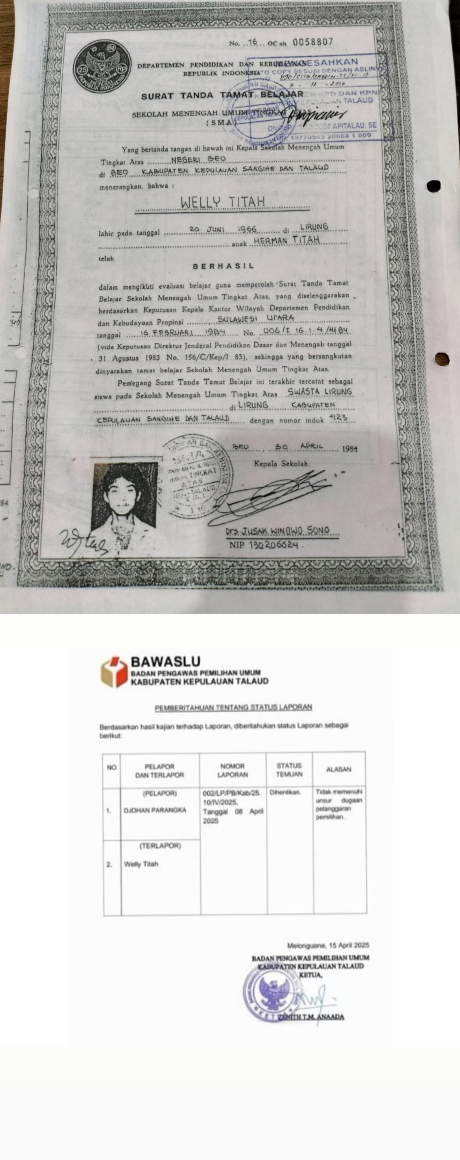 Manado – Pemberhentian penanganan dugaan ijazah palsu milik Wely Tita calon bupati kabupaten Kepulauan Talaud, menuai polemik dan protes dari ketua LSM kaliber Indonesia bersatu Sulawesi Utara Ato Tamila pada saat di mintai keterangan oleh awak media di halaman Polda Sulut 18/4/2025.
