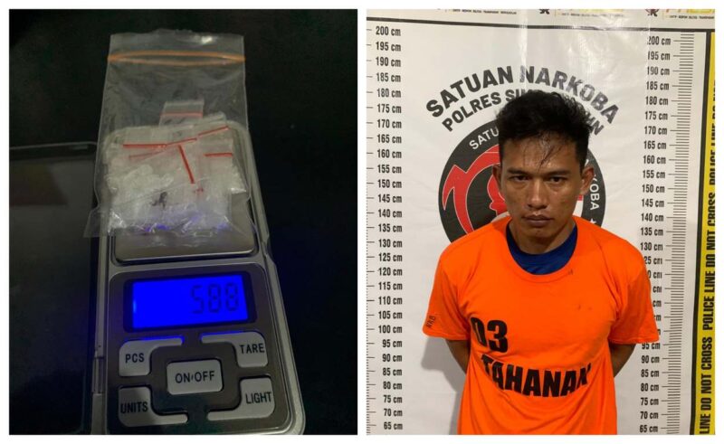 Dari hasil penangkapan, polisi berhasil mengamankan seorang tersangka bernama Suwandi alias Wawan (31), warga Pasar II Bahapal, Kecamatan Bandar Huluan, Kabupaten Simalungun. Pria yang bekerja tidak tetap ini kedapatan memiliki barang bukti berupa 16 bungkus plastik klip sedang yang diduga berisi narkotika jenis sabu dengan berat brutto 5,88 gram.