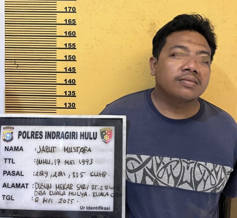 INHU — Seorang pria berinisial JM alias Jarut, warga Dusun Mekar Sari, Desa Kuala Mulya, Kecamatan Kuala Cenaku, Kabupaten Indragiri Hulu, kembali harus berurusan dengan pihak berwajib. Bukan sekali dua kali meresahkan warga, pria ini akhirnya ditangkap aparat kepolisian usai diduga melakukan tindak pidana percobaan Rudapaksa terhadap seorang karyawan toko di wilayah tersebut. Aparat kepolisian dengan sigap menanggapi laporan masyarakat dengan preman ataupun ormas yang meresahkan, dan pihak kepolisian pun “tidak beri toleransi sesuai himbauan dari Kapolda Riau.