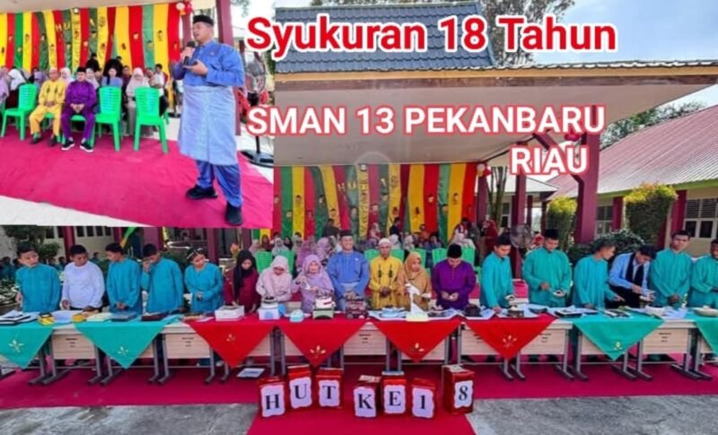 Pekanbaru, – Gaoelnews.com – SMAN 13 Pekanbaru mengadakan acara Syukuran dengan seluruh siswa, guru, Kepsek dan ketua komite sekolah di halaman sekolah SMAN 13 Pekanbaru dengan sederhana. Acara syukuran ini dilaksanakan pada hari Jumat (9/5/2025) untuk memperingati 18 tahun berdirinya SMA NEGERI 13 Pekanbaru.