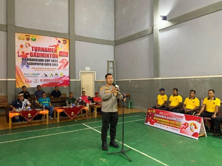 Gayo Lues – Prosesi pembukaan Turnamen Badminton Bhayangkara Cup se-Kabupaten Gayo Lues berlangsung tertib dan lancar pada Jumat, 20 Juni 2025. Dimulai dengan kehadiran para tamu penting seperti Forkopimda Gayo Lues dan pejabat tinggi Polres, acara inti pembukaan disampaikan oleh Kapolres Gayo Lues AKBP Hyrowo, S.I.K.