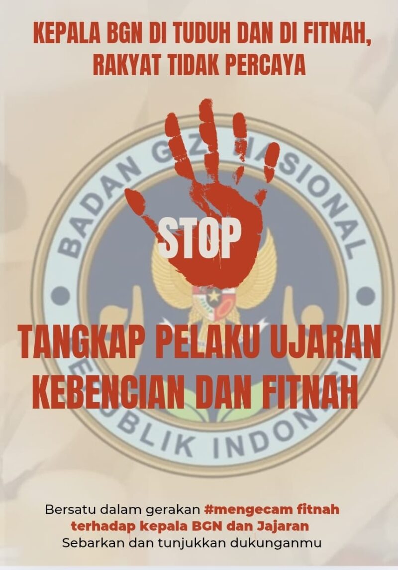 Pihaknya menuntut agar seluruh bentuk kampanye hitam, fitnah, dan ujaran kebencian terhadap Kepala BGN dan jajarannya segera dihentikan. Ia juga mengajak masyarakat untuk bersikap kritis namun tetap bertanggung jawab dalam menyikapi setiap informasi, serta meminta pihak kepolisian dan lembaga berwenang untuk mengusut dan menindak pelaku penyebaran hoaks serta ujaran kebencian sesuai hukum yang berlaku.