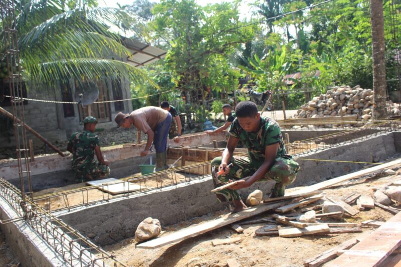 Abdya – Satuan Tugas (Satgas) TNI Manunggal Membangun Desa (TMMD) ke-128 Kodim 0110/Aceh Barat Daya (Abdya) terus mempercepat pengerjaan rehabilitasi rumah tidak layak huni (RTLH) di Desa Gunung Cut. Saat ini, progres pembangunan telah memasuki tahap pemasangan bata sebagai dasar dinding permanen.